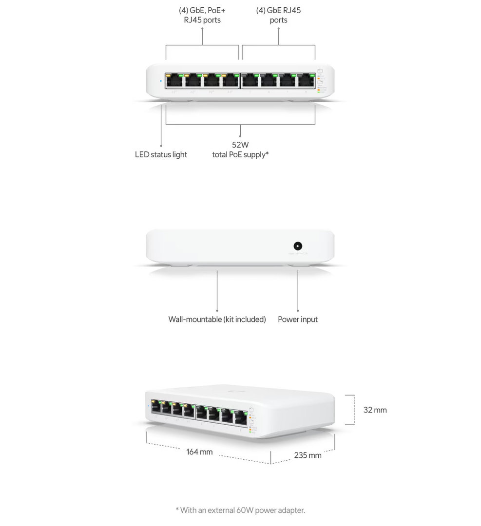 Ubiquiti UniFi 8 Ports Lite Switch, 8x Gigabyte RJ45 ports (4x ports with PoE+), , Non-Blocking Throughput: 8Gbps, Maximum Power Consumption: 8W, powered by 54V DC, Wall-Mountable , 2 Year Warranty